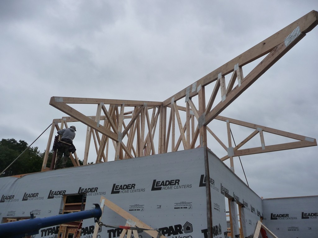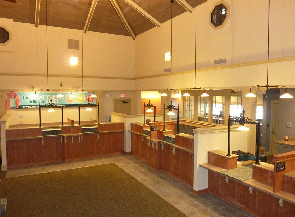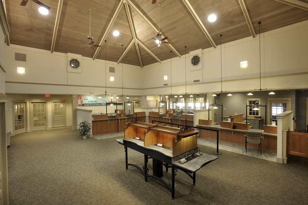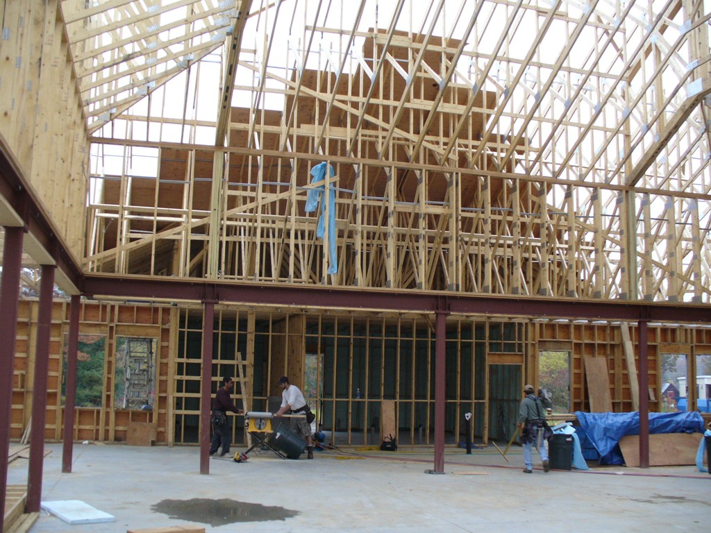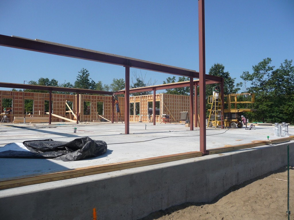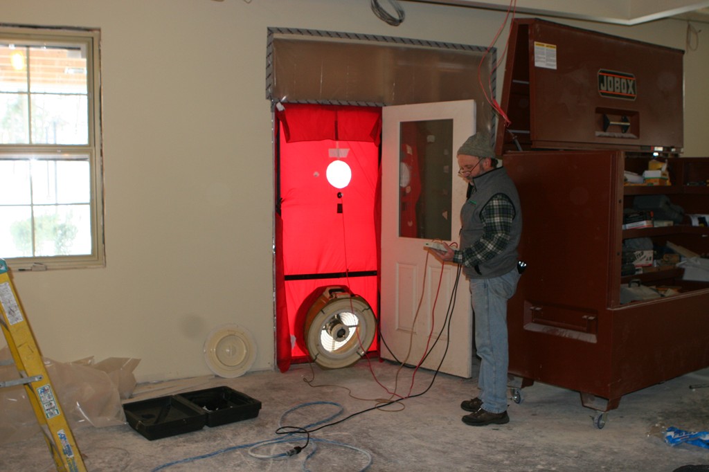 One of our goals when building this 7500 square foot branch for Greenfield Savings Bank, designed by architect Joseph Mattei, AIA, was to demonstrate that a large building can be built to the same energy saving standards as a small building. With a final Energy Star Leakage Area Calculation of 1.01 sq/in per 100 sq/ft (14,400 sq/in) of shell area, everybody was pleased with the results. Once we had the shell insulated, we heated the entire site during the interior finish in the winter with one wall hung Modine heater.