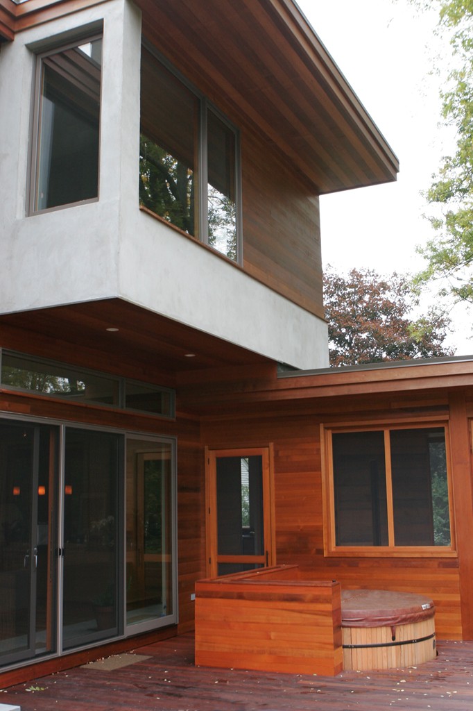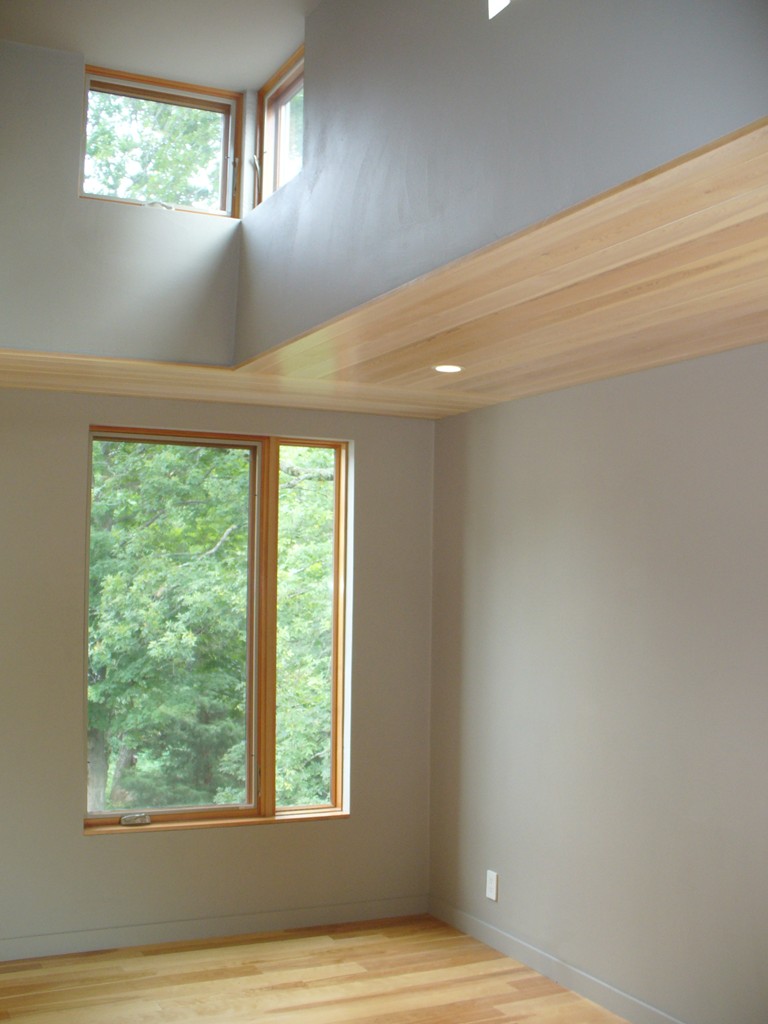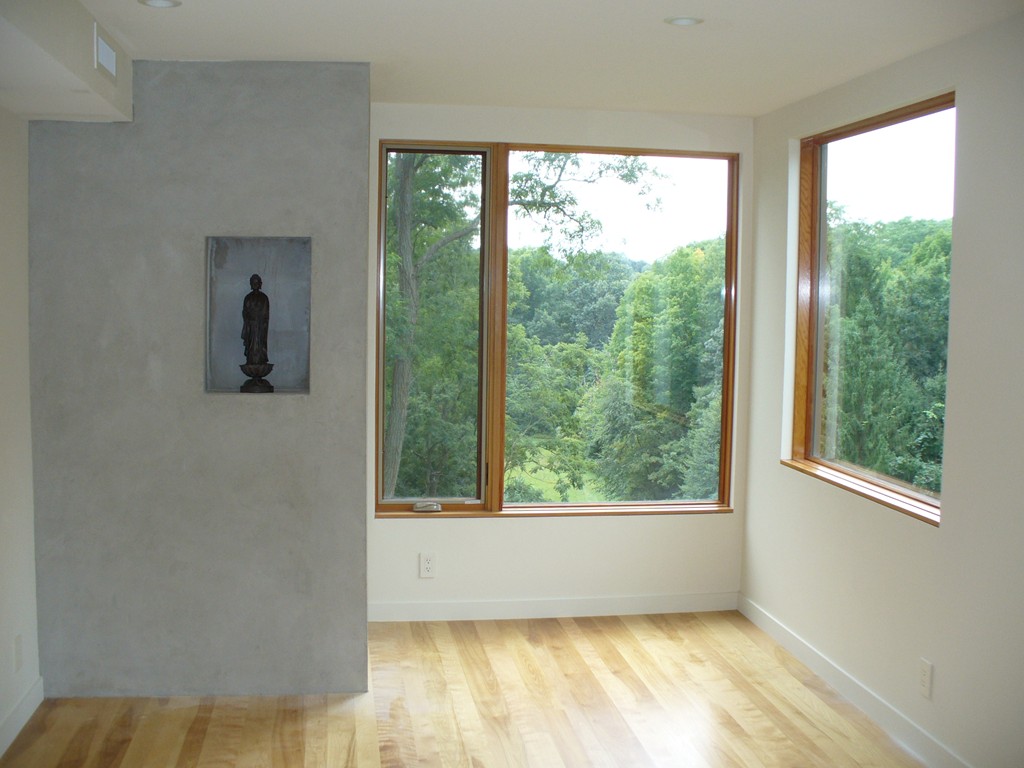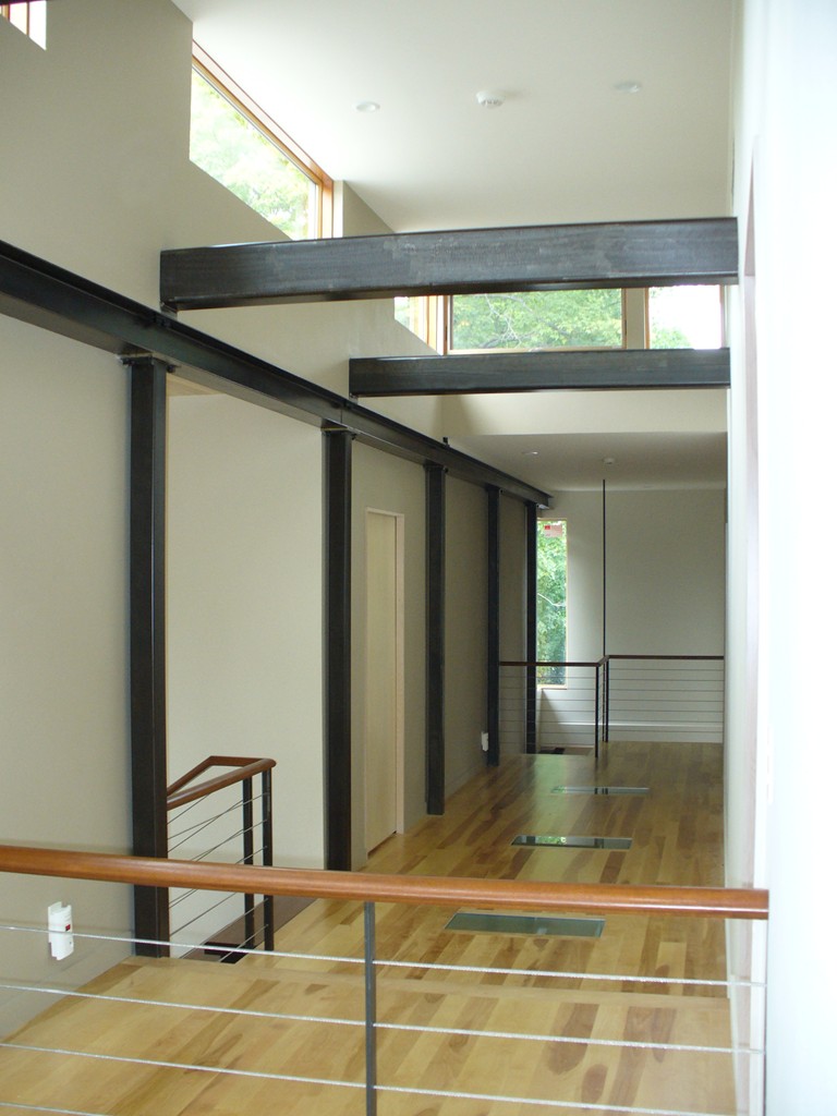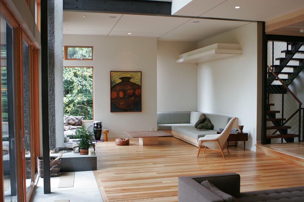 This custom contemporary home in Northampton is modern in appearance and modern in its low energy consumption as well. Designed by Michael Singer, some of the special features of this house are the exposed steel frame, lots of natural wood, and light coming from unexpected places. A geothermal heating system, energy efficient windows, and radiant heating all combine to make it as comfortable as it is beautiful.